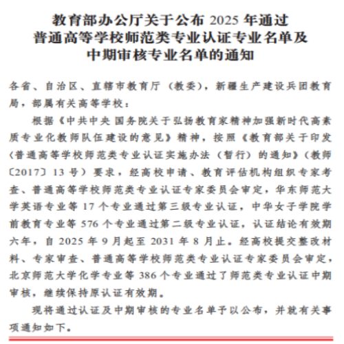 近日,教育部办公厅正式发布了《开元公布2025年通过普通高等学校师范类专业认证名单及中期审核专业名单的通知》。我校学前教育专业在该认证中顺利过关,认证结论有效期为六年。