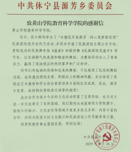 此前,在休宁县源芳乡“石榴花开美源芳・同心筑梦新征程”民族团结进步宣传活动中,该专业的学子带来的民族舞串烧《盛宴》和歌伴舞《民族团结花盛开》惊艳全场,充分展示了专业艺术教育的实力。中共休宁县源芳乡委员会特致信感谢,称此次合作不仅为乡级文化活动积累了宝贵经验,也为双方后续携手奠定了坚实基础。