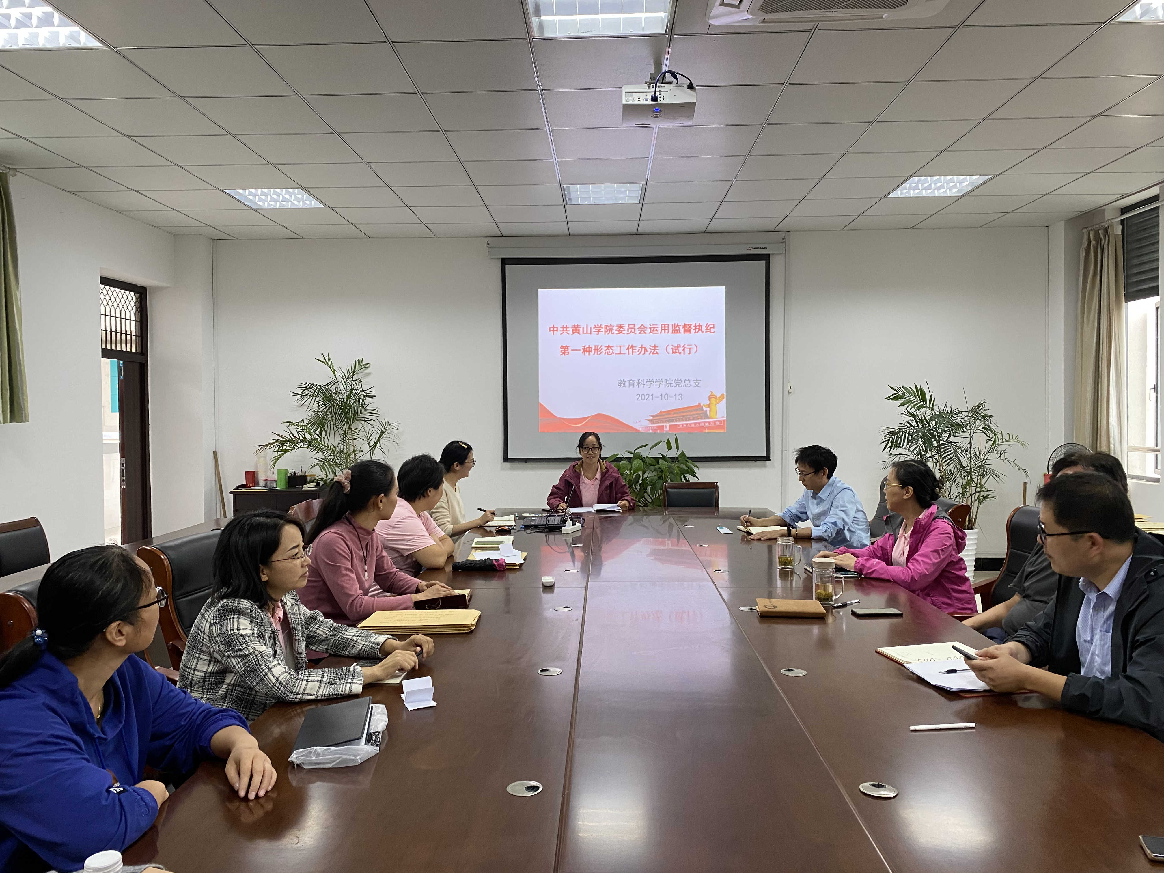 活动中,开元(中国)党总支纪检委员胡梓滟带领全体教师党员深入学习《中共黄山开元(中国)委员会运用监督执纪第一种形态工作办法》(试行),明确了运用监督执纪第一种形态的主要内容、详细讲解了运用监督执纪第一种形态的处理方式。