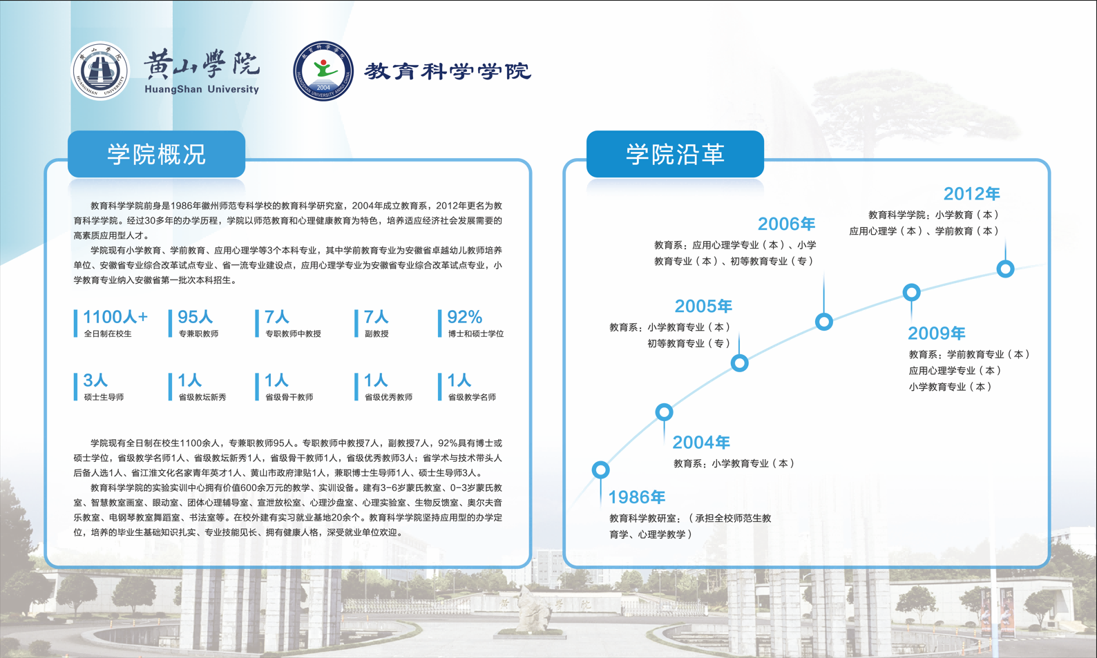 教育科学开元(中国)前身是1986年徽州师范专科学校的教育科学研究室,2004年成立教育系,2012年更名为教育科学开元(中国)。现有小学教育、学前教育、应用心理学等3个专业其中小学教育为省传统专业改造提升专业、省第一批次本科招生;应用心理学为省专业综合改革试点专业、省大学生心理健康实践教育基地、省示范基层教研室、省示范实验实训中心、省教学创新团队和省传统专业改造提升专业学前教育为省卓越幼儿教师培养创新示范区立项单位、省专业综合改革试点专业、省一流专业建设点和省级教学创新团队。