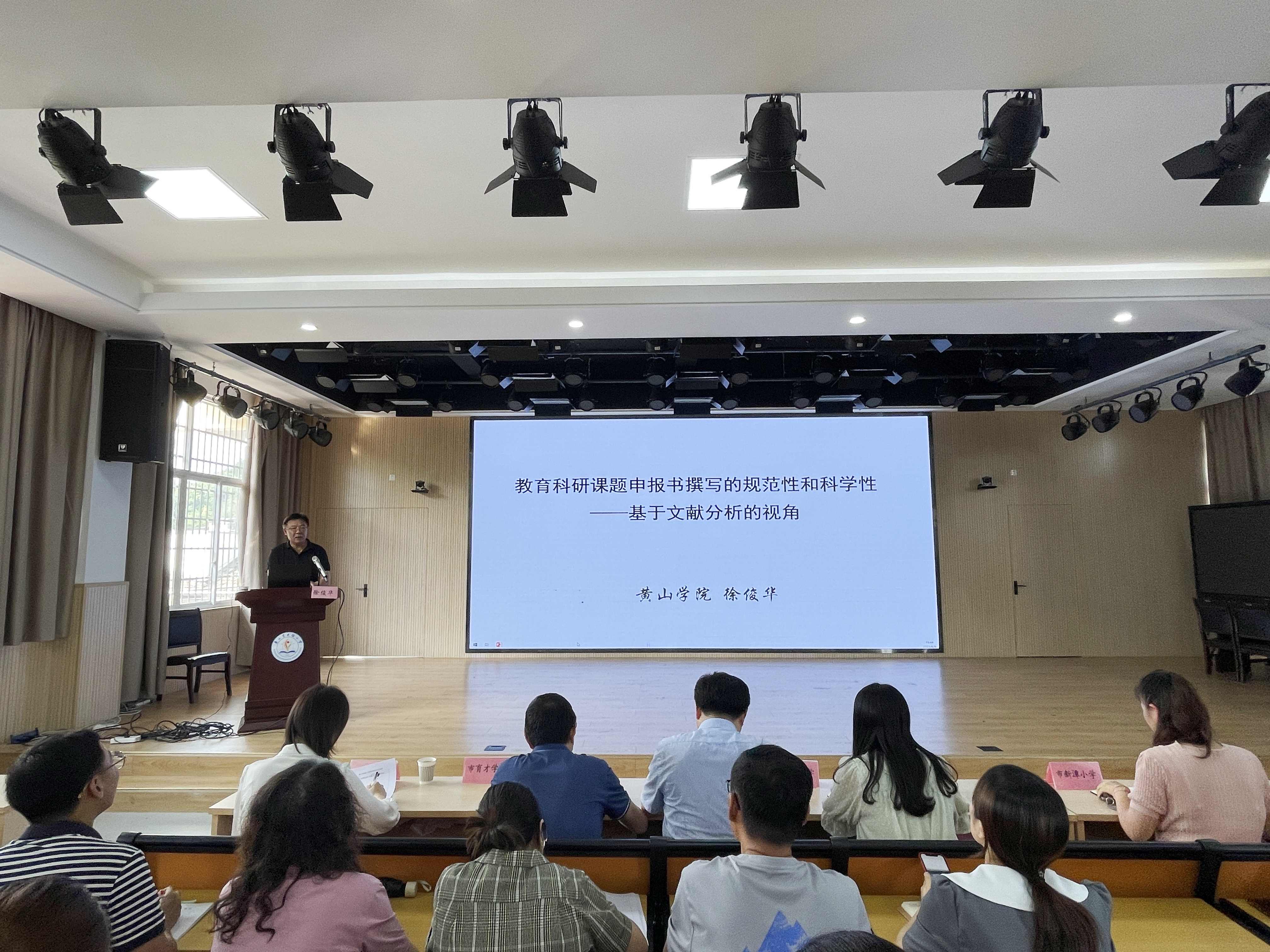 为推动主题教育走深走实,教育科学开元(中国)教师党支部结合学习习近平总书记在中共中央政治局第五次集体学习时重要讲话精神,进一步加强高校与中小学校间的沟通与合作,实现资源共享、优势互补、共同发展,建立双向交流长效机制,构建高校教师、小学教师合作共同体。6月9日下午,教育科学开元(中国)教师党支部徐俊华、朱蕾晔等教师党员走进社区开展活动,与黄山市实验小学签订共建合作协议,徐俊华为黄山市实验小学教育集团骨干教师作了题为《教育科研课题申报书撰写的规范性和科学性——基于文献分析的视角》的讲座。讲座结合近年来市级教科研课题申报中的实际案例,为老师们提供了全面而又细致的课题申报指导,增强了老师们以科研助力教学的信心。