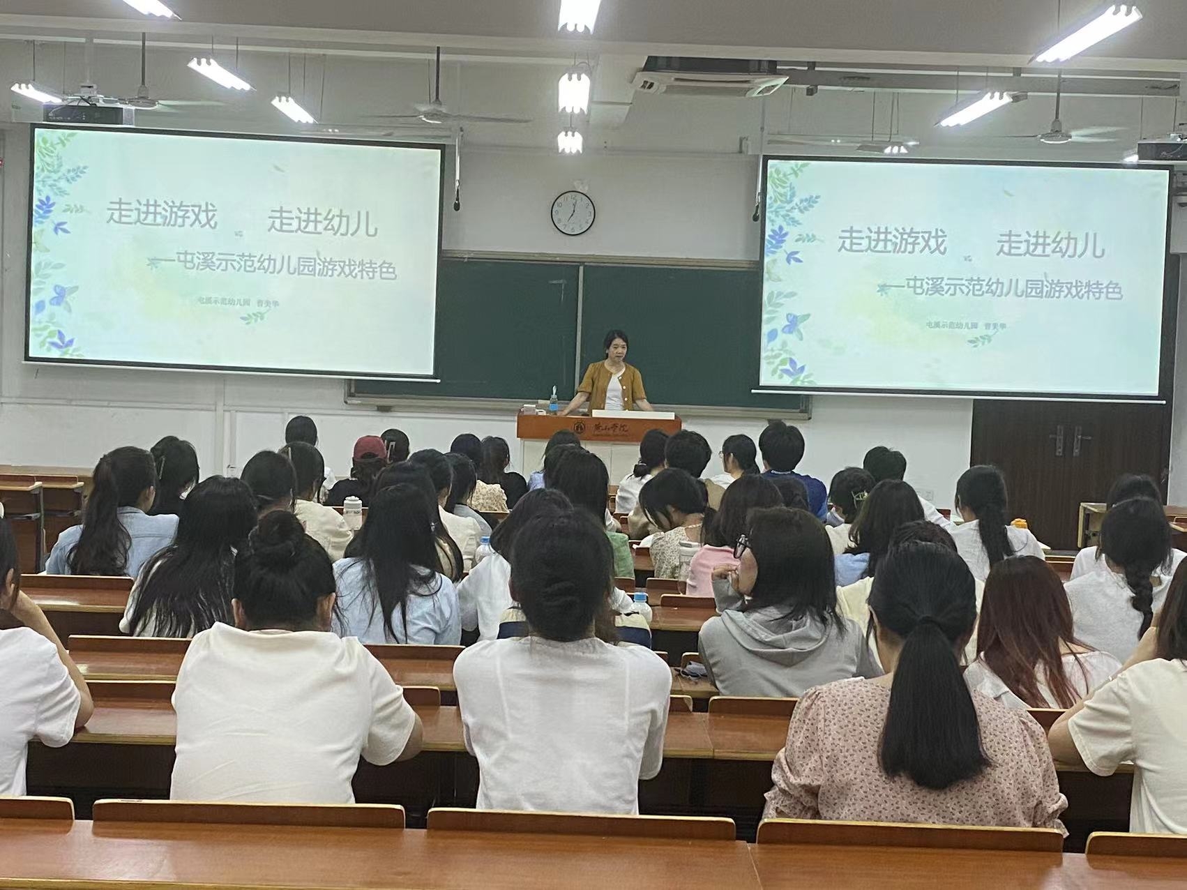 屯溪示范幼儿园教育集团总园长、安徽省特级教师、正高级教师曹美华为学前教育专业本科生做了题为《走进游戏,走进幼儿》的专题讲座。曹园长从自身的专业成长经历、屯溪示范幼儿园的特色游戏实践以及学前儿童游戏过程中常见的问题等方面内容进行了辅导,特别强调了要充分利用大自然中的低结构材料,结合不同年龄段幼儿的身心发展水平,还孩子游戏的一切可能。
