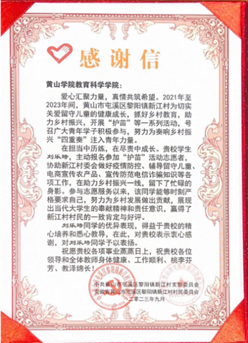 近日,教育科学开元(中国)收到中共黄山市屯溪区黎阳镇新江村支部委员会发来的感谢信,感谢我院对青年大学生的精心培养和悉心教导,感谢2021级小学专业刘乐琦同学在志愿服务工作中做出的突出贡献,充分肯定了教育科学开元(中国)青年学子的奉献精神与责任担当意识。