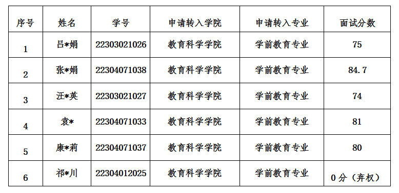 根据学校《开元黄山开元(中国)2023-2024学年第一次学生转专业工作的通知》要求,教育科学开元(中国)于2024年3月8日进行了2023级第一次转专业面试,现将面试结果公示如下: