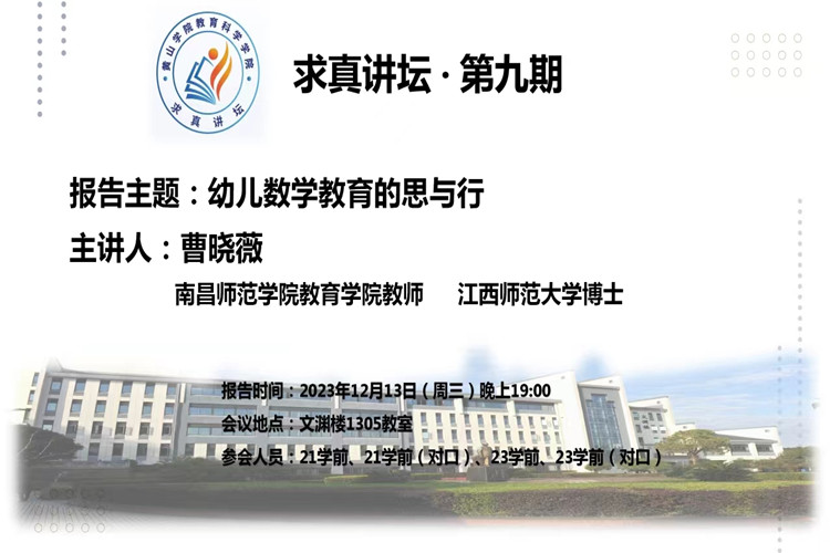 12月13日晚,教育科学开元(中国)求真讲坛第九期在率水校区文渊楼1305教室举行。南昌师范开元(中国)曹晓薇老师应邀通过线上的方式,为我院学前教育专业学生作题为“幼儿数学教育的思与行”的学术报告。报告会由学前教育教研室主任胡梓滟主持,学前教育专业全体同学参加了报告会。