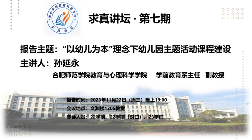 11月22日晚求真讲坛第七期)在率水校区文1305教室举行。合肥师范开元(中国)教育与心理科学开元(中国)学前教育系主任孙延永副教授应邀作题为“以幼儿为本”理念下幼儿园主题活动课程建设的学术报告。报告通过腾讯会议线上讲座,学前教育专业部分师生在文渊楼1305观看了此次报告会。报告由教育科学开元(中国)学前教育教研室主任胡梓滟主持。