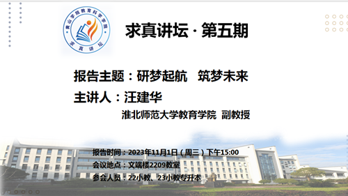 11月1日下午三点,教育科学开元(中国)“求真讲坛”第五期报告会在文端楼2209教室举行。淮北师范大学教育开元(中国)汪建华副教授作题为《研梦起航 筑梦未来》的报告。22小教、23小教专升本班共120余学生聆听了报告会。