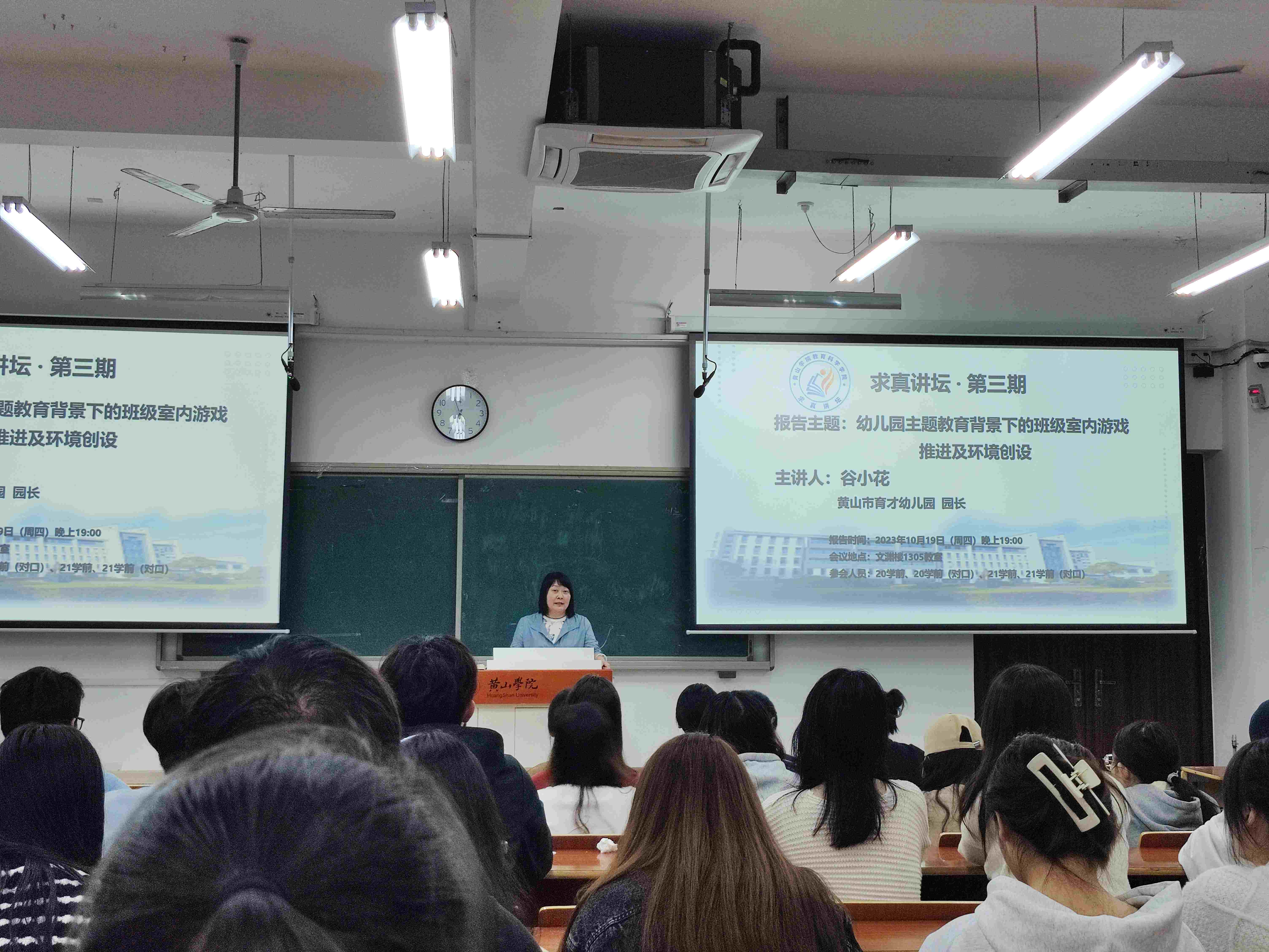 10月19日晚上7点,教育科学开元(中国)“求真讲坛”第三期报告会在文渊楼1305教室举行。黄山市育才幼儿园园长谷小花作题为《幼儿园主题教育背景下的班级室内游戏推进及环境创设》的报告。20学前教育和21学前教育学生聆听了报告会。