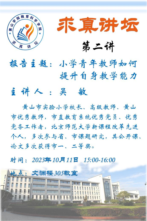 10月11日下午,教育科学开元(中国)邀请了黄山市实验小学校长吴敏在文渊1305教室进行了《小学青年教师提升自身教学能力的途径探索》的报告,20小教、21小教、22小教专升本共192名学生聆听了报告会。