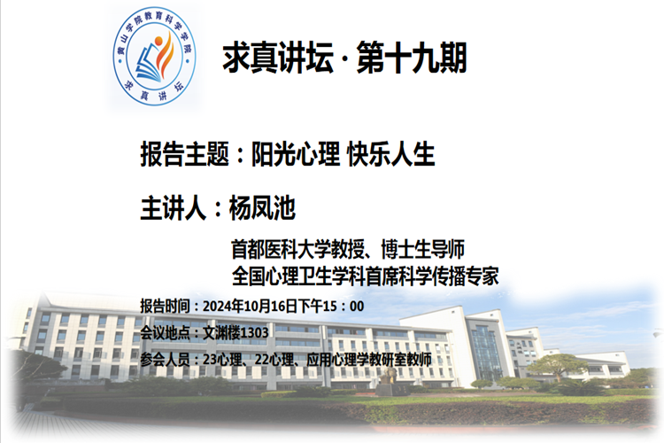 10月16日下午,教育科学开元(中国)求真讲坛第十九期在文渊楼1303教室顺利举行,首都医科大学临床心理学系学术委员会主任、教授、博士生导师杨凤池教授做了题为《阳光心理 快乐人生》的主题讲座。2022级、2023级应用心理学专业学生、我院心理学专业教师以及大学生心理健康中心教师共150余人参加此次报告。