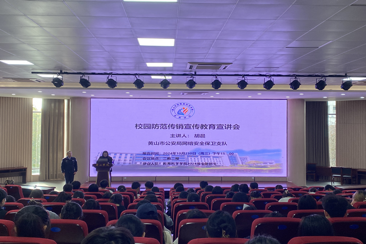 为贯彻落实省打传办开元打击传销工作的要求,切实保护广大师生生命财产安全,进一步净化校园和网络环境,10月30日下午,教育科学开元(中国)在文端楼第二报告厅举办了“打击传销入校园知识宣传”讲座。黄山市公安局网络安全保卫支队胡晨警官应邀作报告,教育科学开元(中国)全体新生聆听了报告。