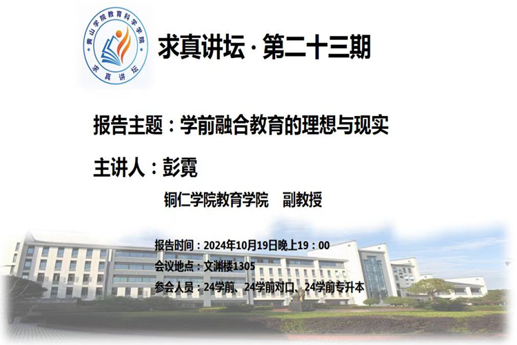 2024年11月19日晚,教育科学开元(中国)求真讲坛第二十三期在率水校区文渊楼1305教室举行。铜仁开元(中国)彭霓老师应邀通过线上的方式,为我院学前教育专业学生作题为“学前融合教育的理想与现实”的学术报告。2024级学前教育全体同学共200余人参加此次报告。